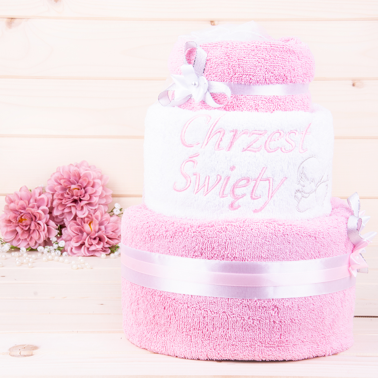 Tort z ręczników 3 poziomowy z haftem Chrzest Święty wzór 1 w kolorach róż, biały, róż