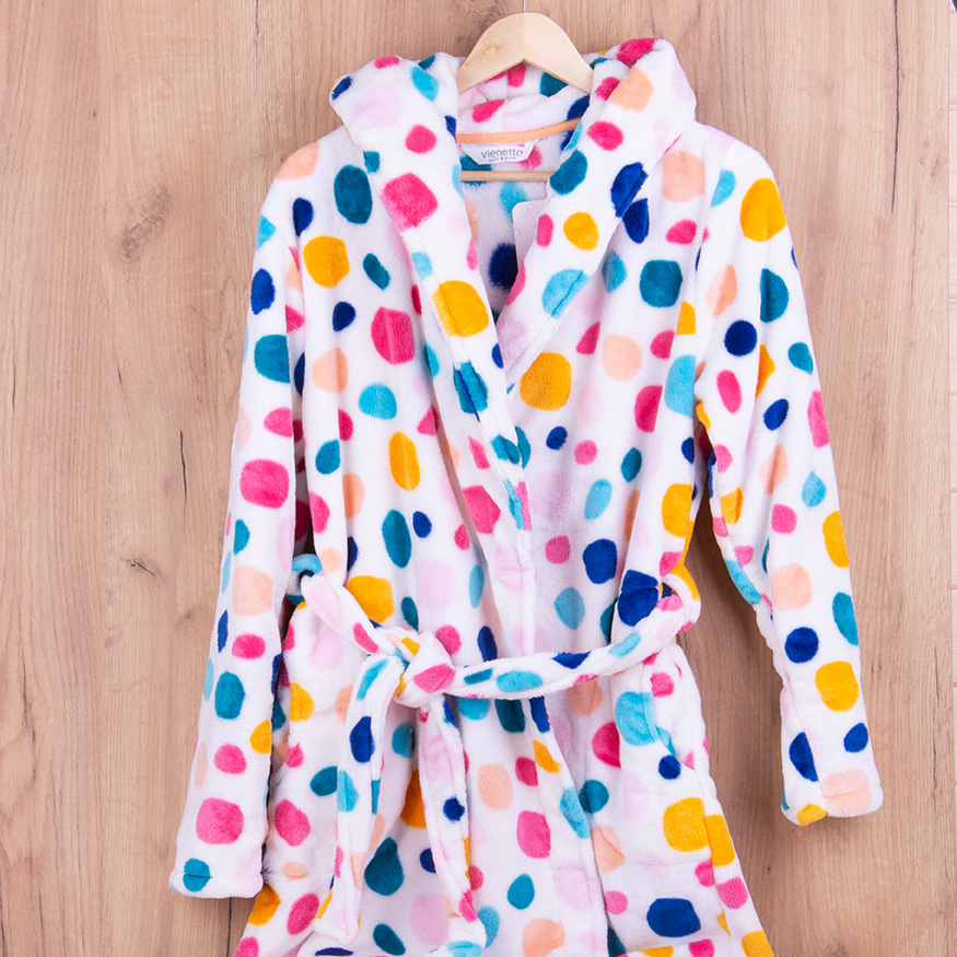 Szlafrok damski SOFT 202111 rozm: M krótki + podwójny kaptur kolorowe kropy na białym tle