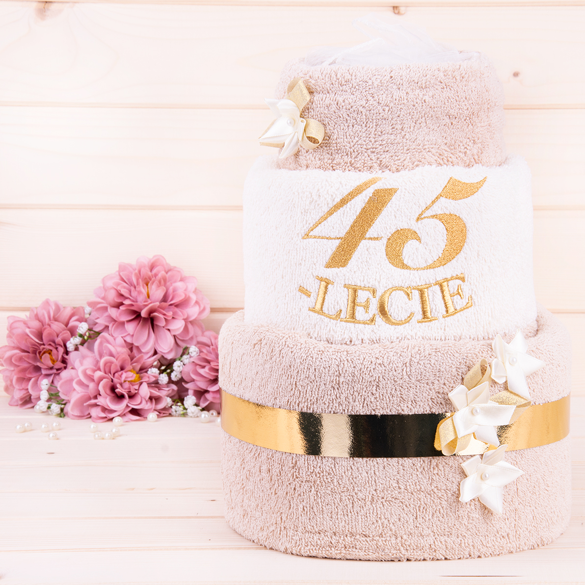 Tort z ręczników 3 poziomowy z haftem 45 lecie wzór 1