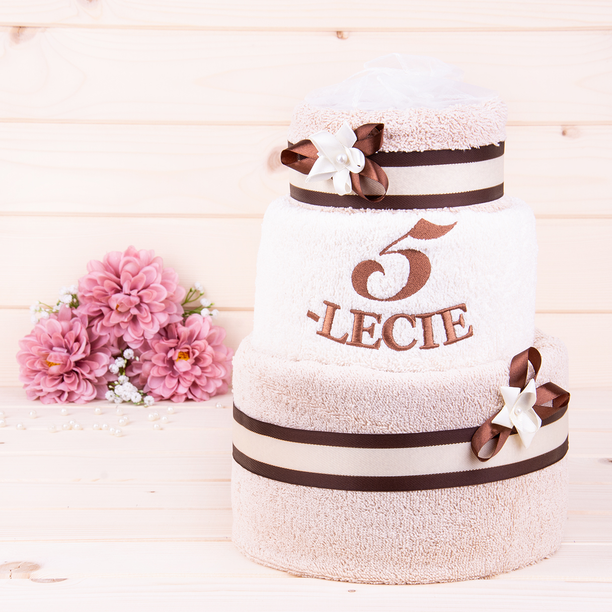 Tort z ręczników 3 poziomowy z haftem 5 lecie wzór 1 w kolorach jasny beż, ecru, jasny beż