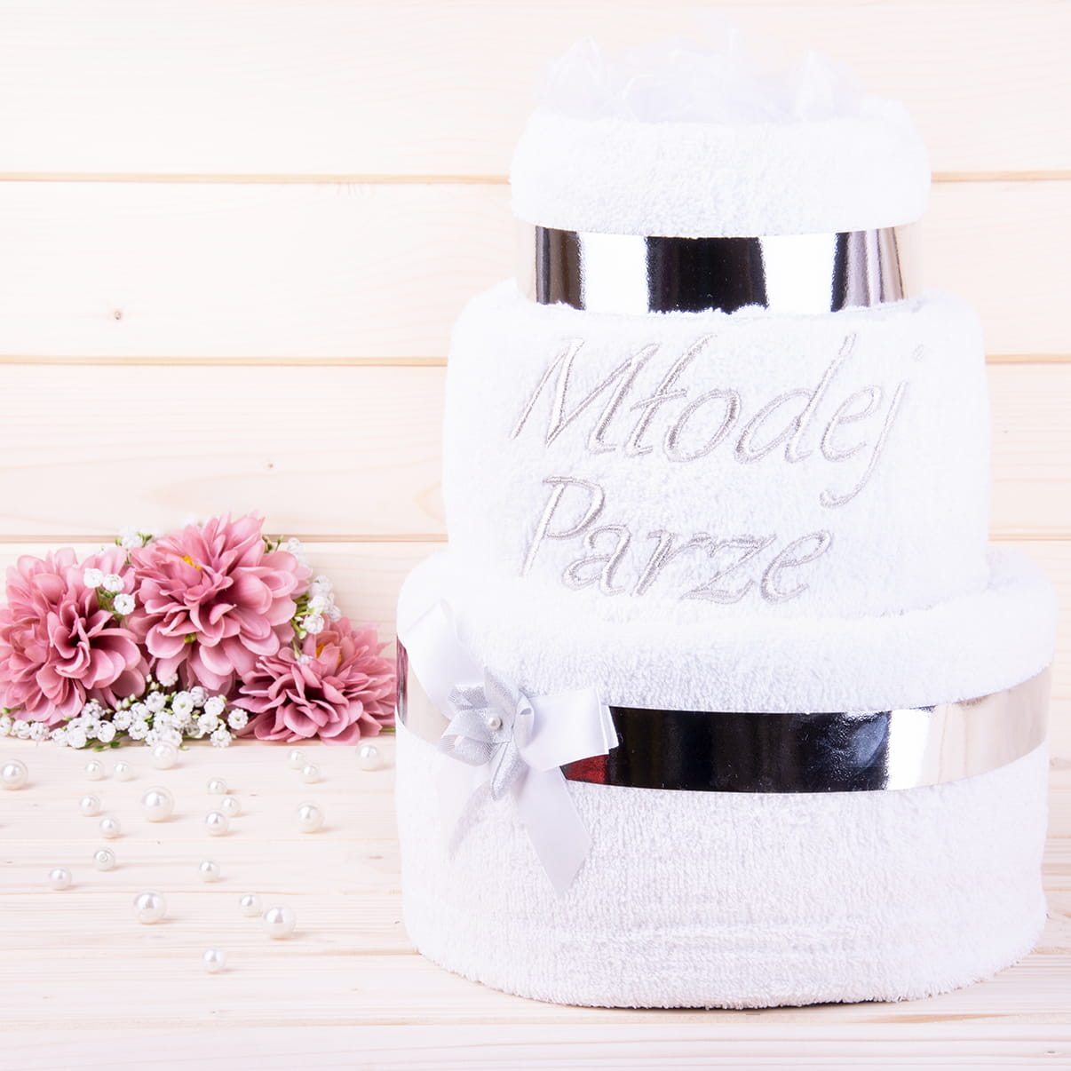 Tort z ręczników 3 poziomowy z haftem Młodej Parze wszystkie ręczniki w kolorze białym