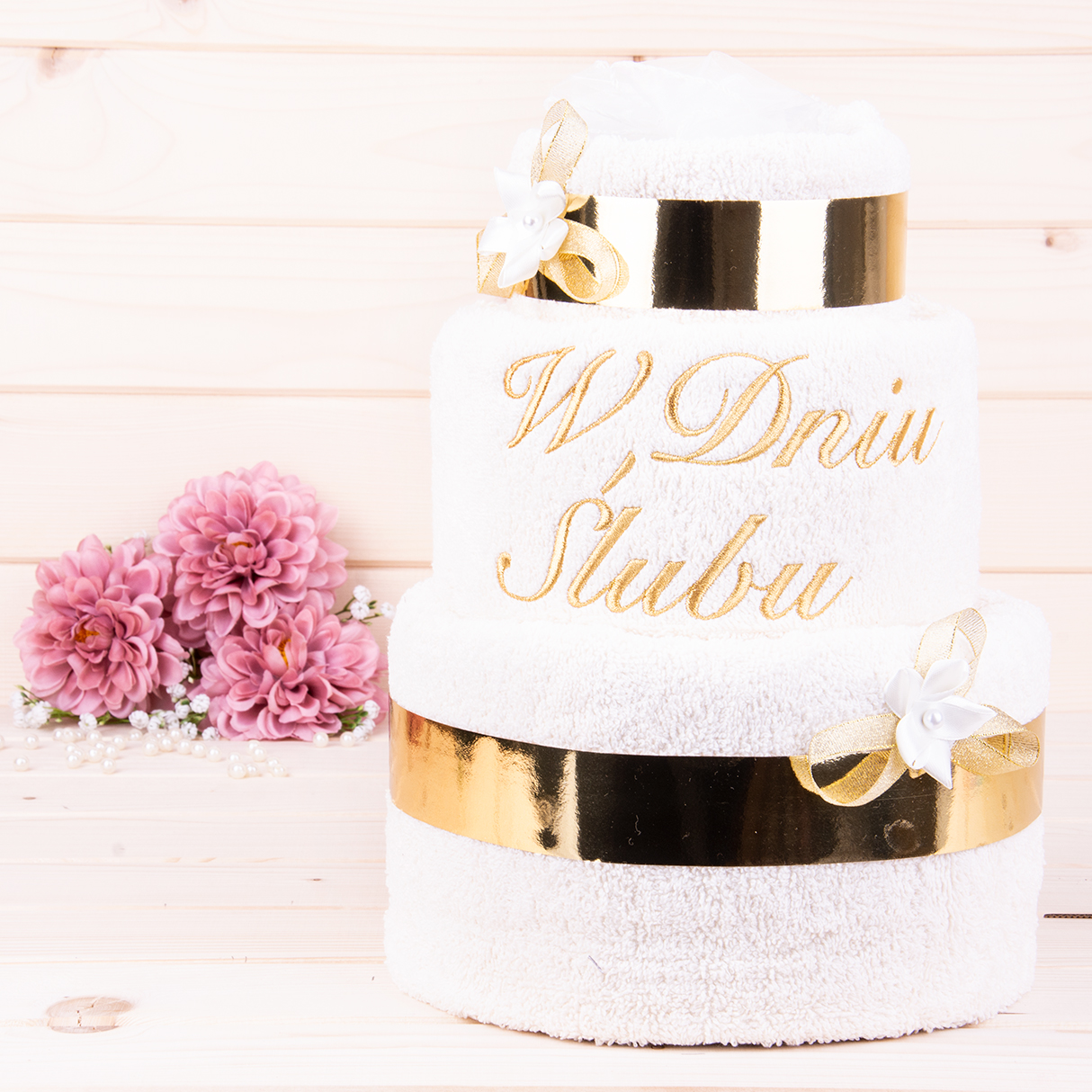 Tort z ręczników 3 poziomowy z haftem W dniu ślubu