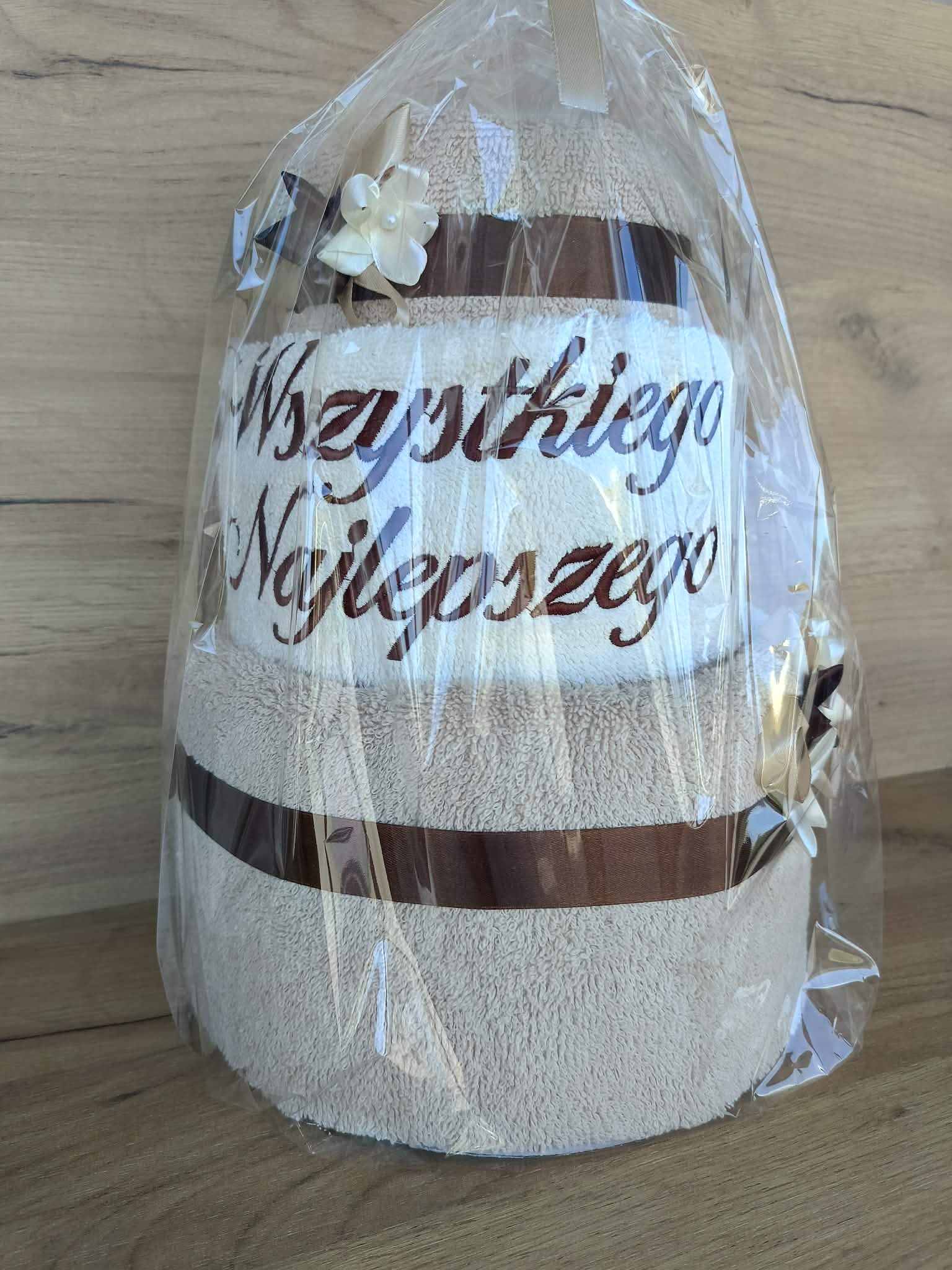 Tort z ręczników 3 poziomowy z haftem Wszystkiego najlepszego wzór 24 w kolorach jasny beż, ecru, jasny beż
