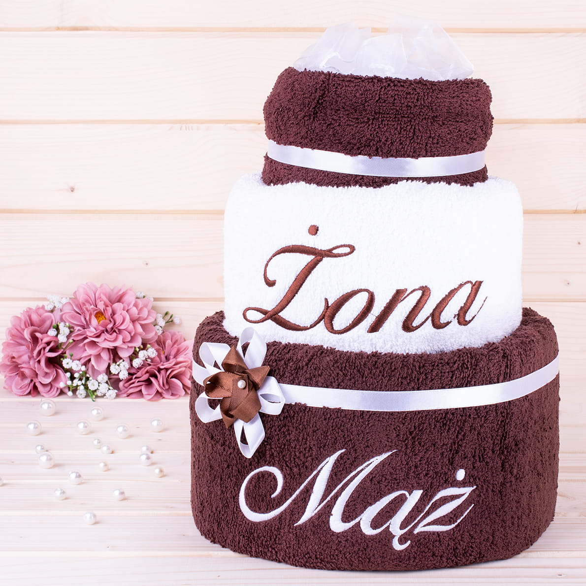 Tort z ręczników 3 poziomowy z haftem Żona Mąż wzór 31 w kolorach ciemny brąz, biały, ciemny brąz
