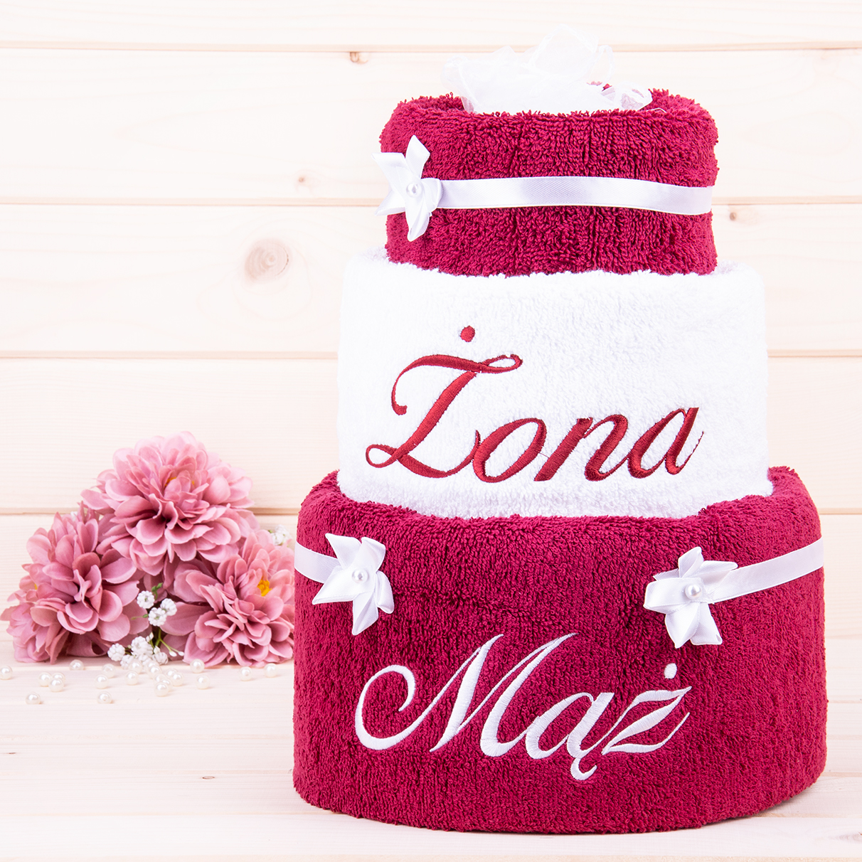 Tort z ręczników 3 poziomowy z haftem Żona Mąż wzór 4 w kolorach bordo, biały, bordo