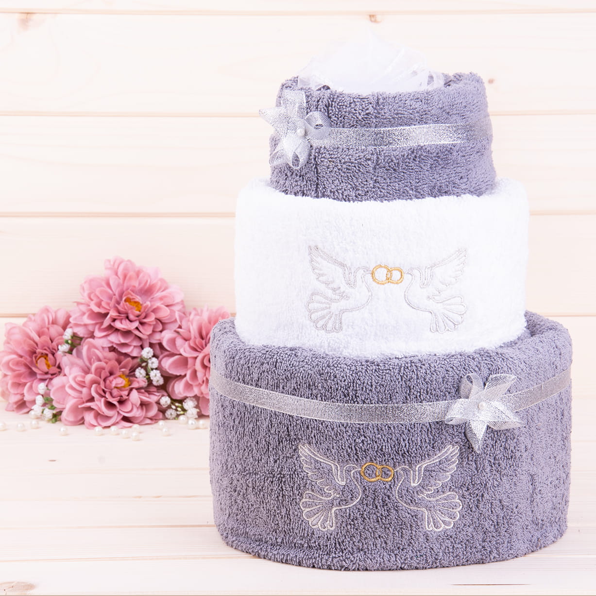 Tort z ręczników 3 poziomowy z haftem Gołąbki w kolorach szary, biały, szary