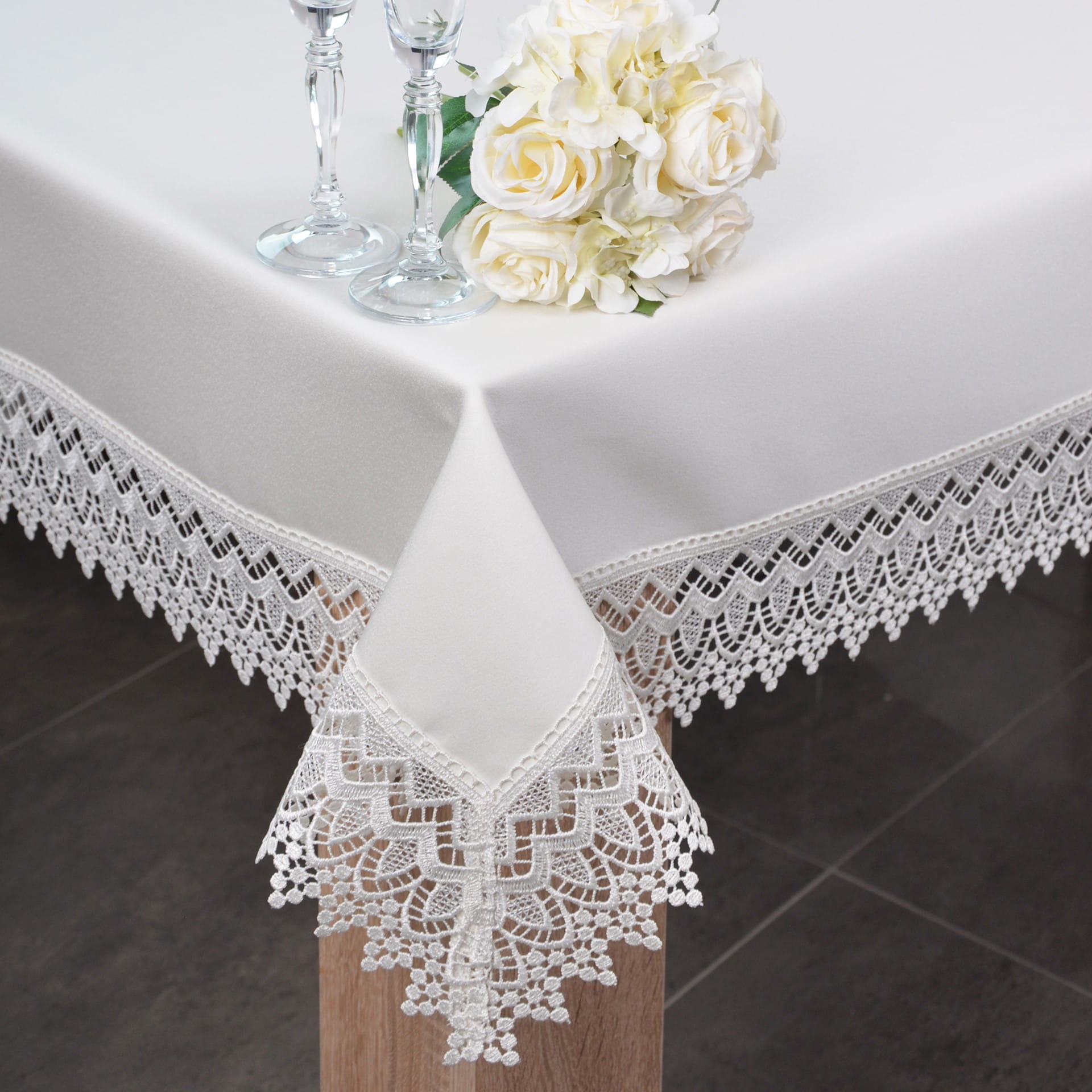 Atłas to wyjątkowa kolekcja gładkich, plamoodpornych obrusów wykończonych ozdobną gipiurą o szerokości 9 cm, która nadaje eleganckiego szyku.