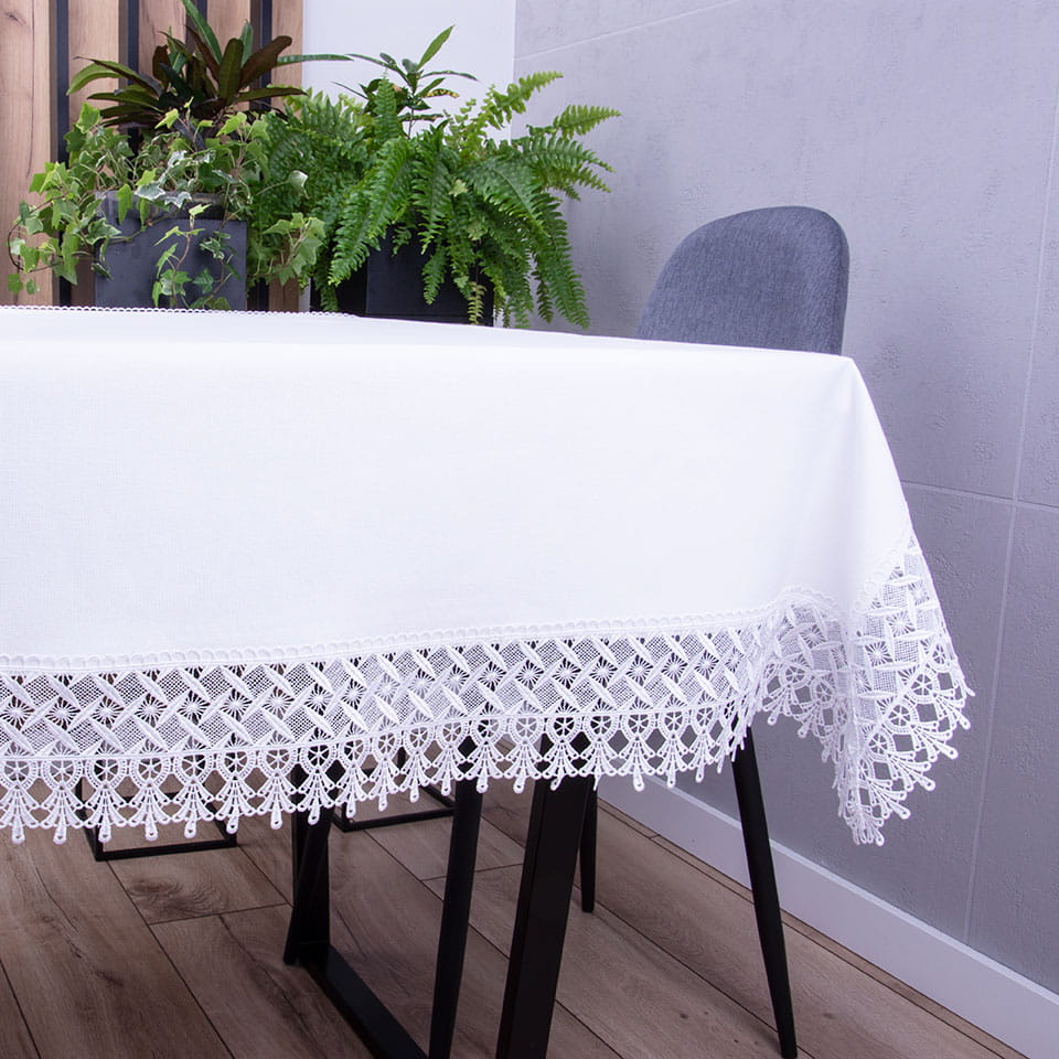 DA-555 to wyjątkowa kolekcja materiałowych obrusów wykończonych ozdobną gipiurą o szerokości 11 cm.