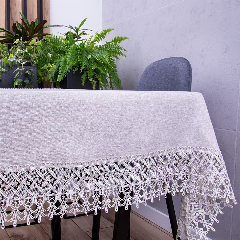 DA-555 to wyjątkowa kolekcja materiałowych obrusów wykończonych ozdobną gipiurą o szerokości 11 cm.