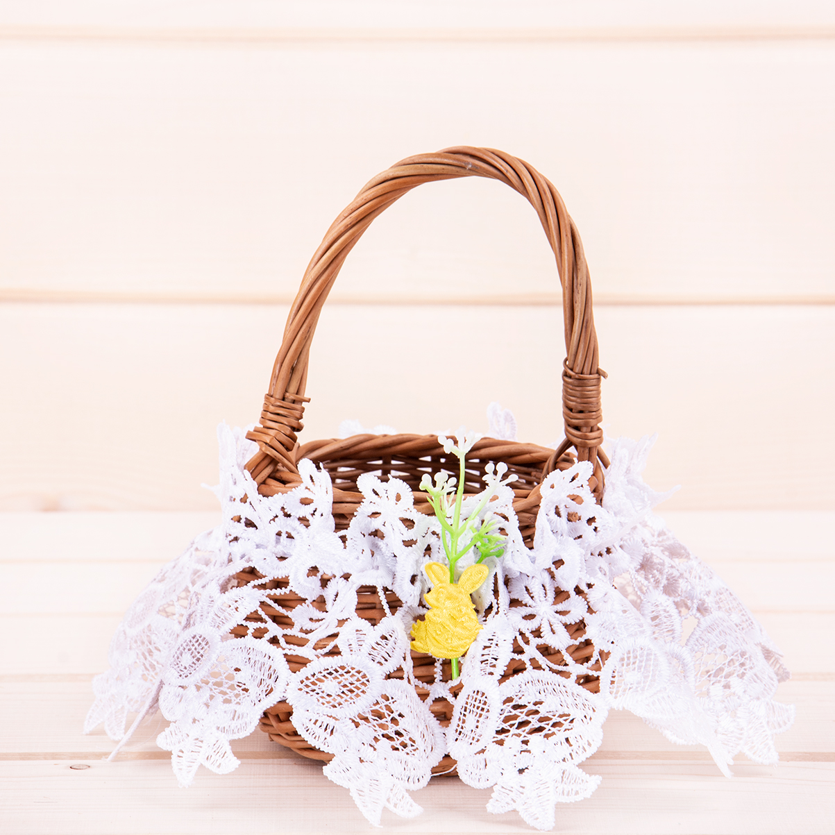 Dekoracja została wzbogacona o uroczy wielkanocny akcent – małego żółtego zajączka z wiosenną gałązką, który wprowadza radosny i wiosenny klimat. Biała gipiura doskonale komponuje się z wiklinowym koszyczkiem oraz tradycyjnymi elementami święconki, takimi jak pisanki, baranek czy bukszpan.