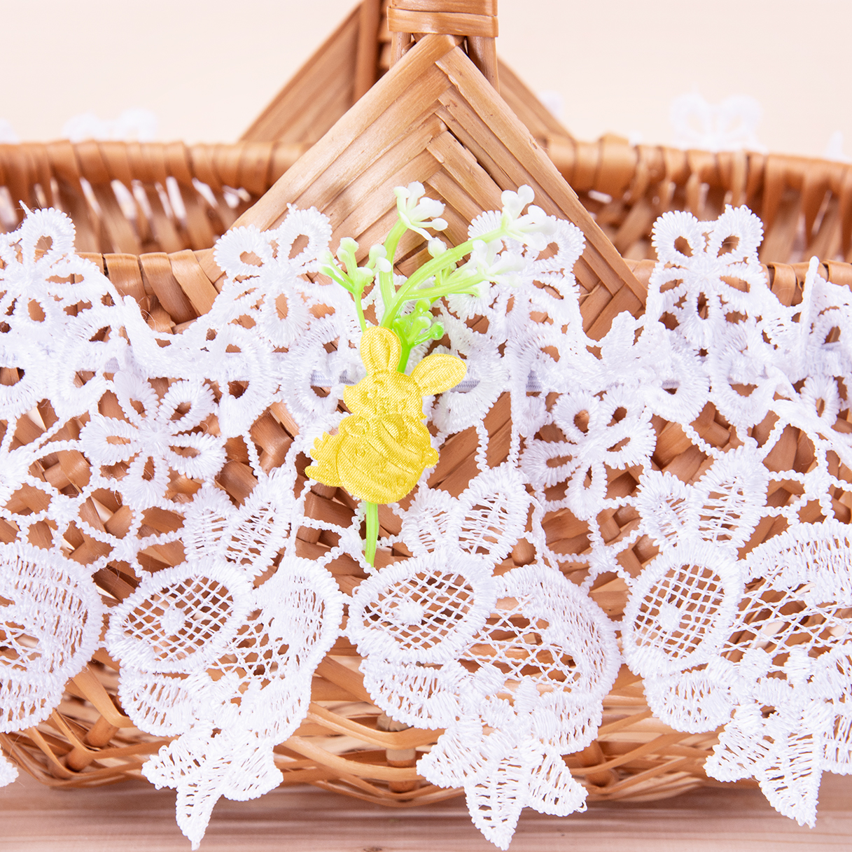 Dekorację uzupełnia uroczy wielkanocny akcent – mały żółty zajączek z wiosenną gałązką, który wprowadza radosny, świąteczny klimat. Biała koronka doskonale komponuje się z naturalną wikliną koszyka oraz tradycyjnymi elementami święconki, takimi jak pisanki, baranek czy bukszpan.