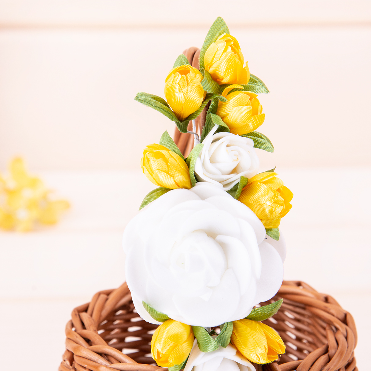 Dekoracyjna ozdoba na koszyk wielkanocny – Różyczki białe z żółtym to subtelny dodatek, który pięknie podkreśli wygląd tradycyjnego koszyczka wielkanocnego ze święconką. Kompozycja z białych różyczek z żółtym środkiem nadaje dekoracji delikatny, wiosenny charakter i doskonale wpisuje się w wielkanocne aranżacje.