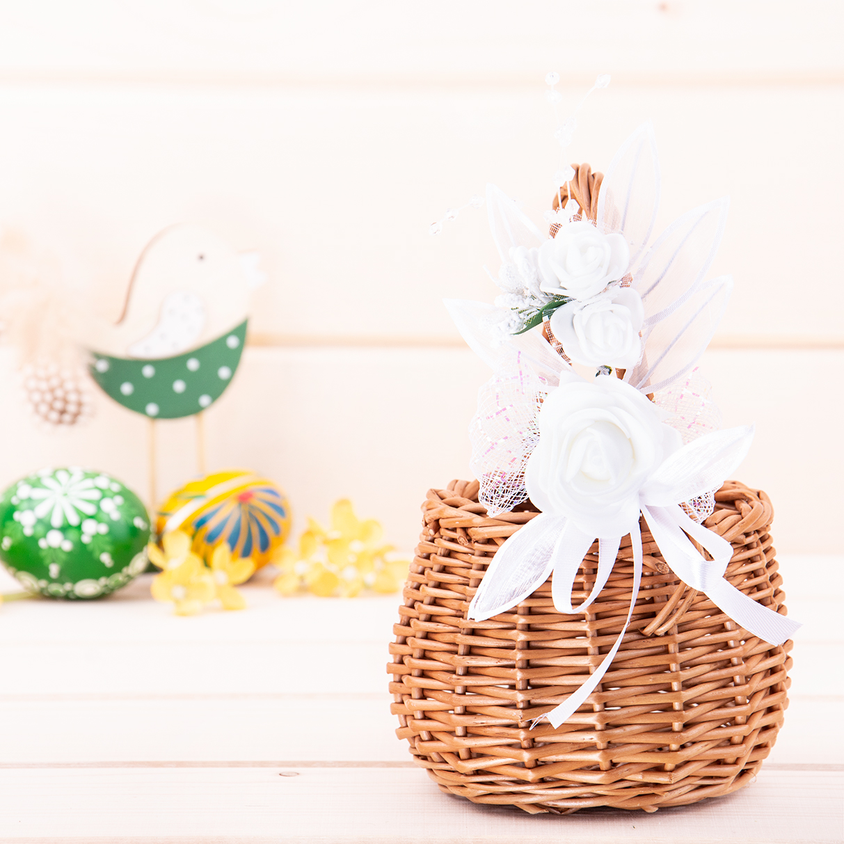 Ozdoba z motywem różyczek to elegancki detal, który podkreśli tradycyjny i świąteczny charakter koszyczka wielkanocnego.