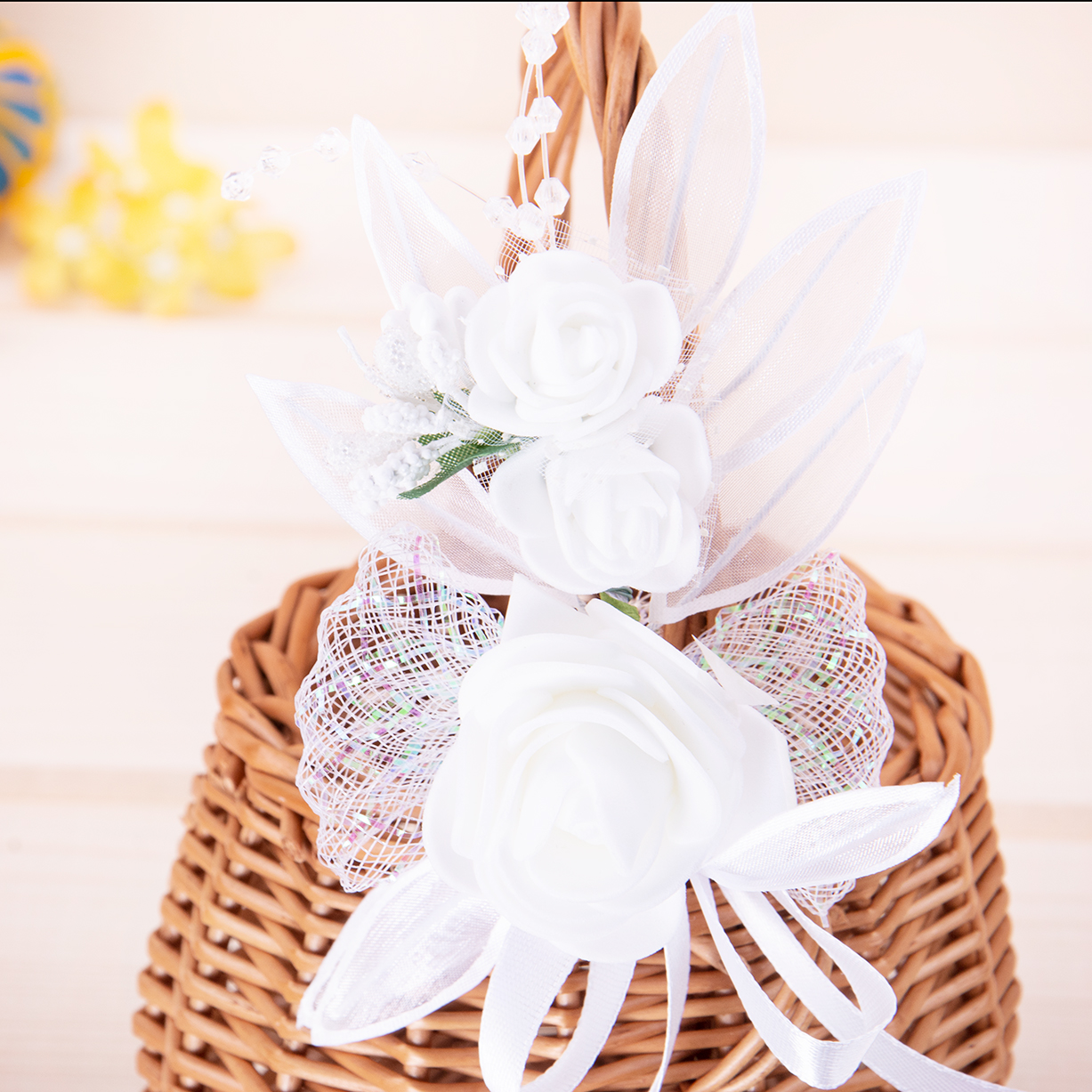 Dekoracyjna ozdoba na koszyk wielkanocny – Różyczki wzór 11 to subtelny dodatek, który pięknie podkreśli wygląd tradycyjnego koszyczka wielkanocnego ze święconką. Kompozycja z ozdobnych różyczek nadaje koszykowi elegancki, wiosenny charakter i sprawia, że świąteczna dekoracja prezentuje się wyjątkowo estetycznie.