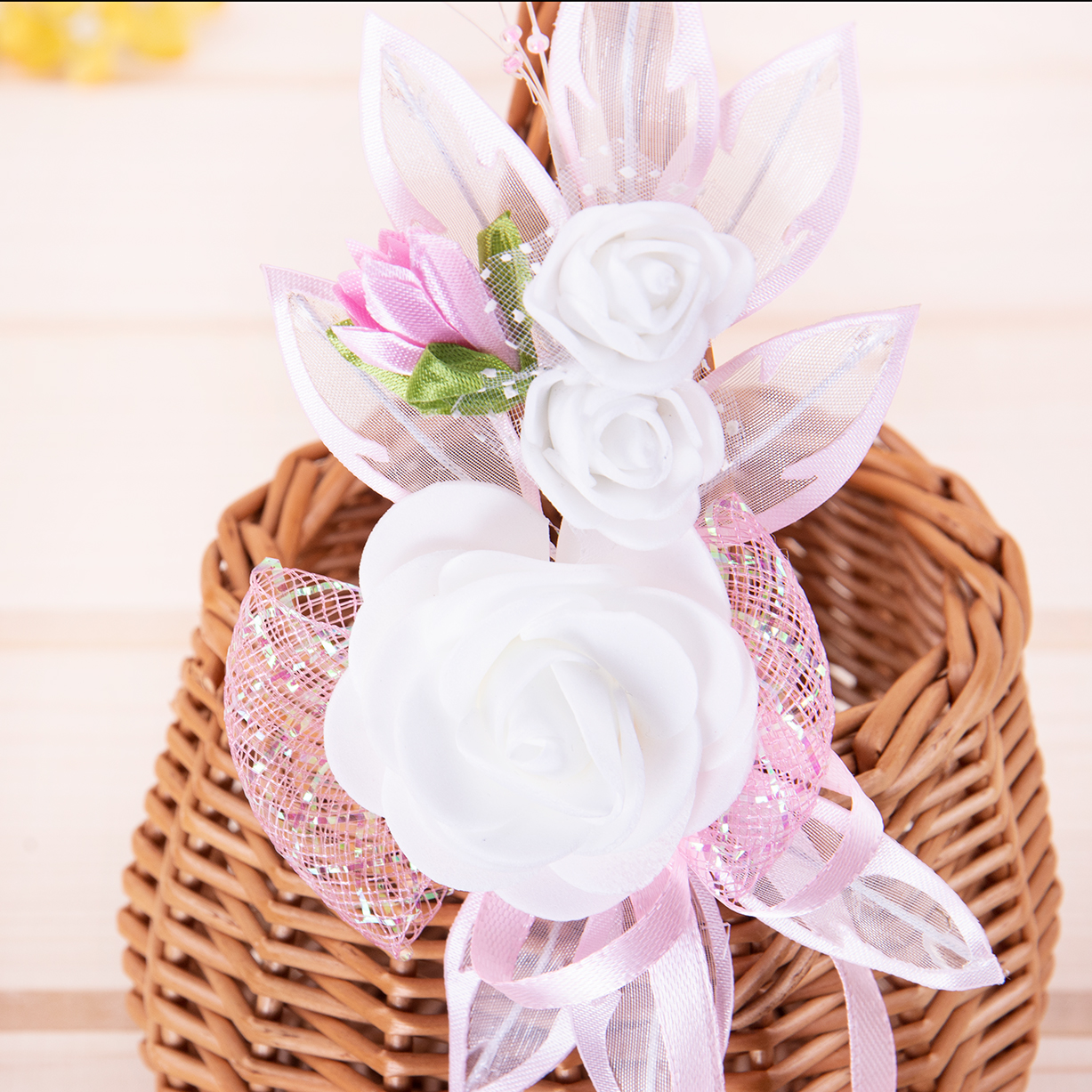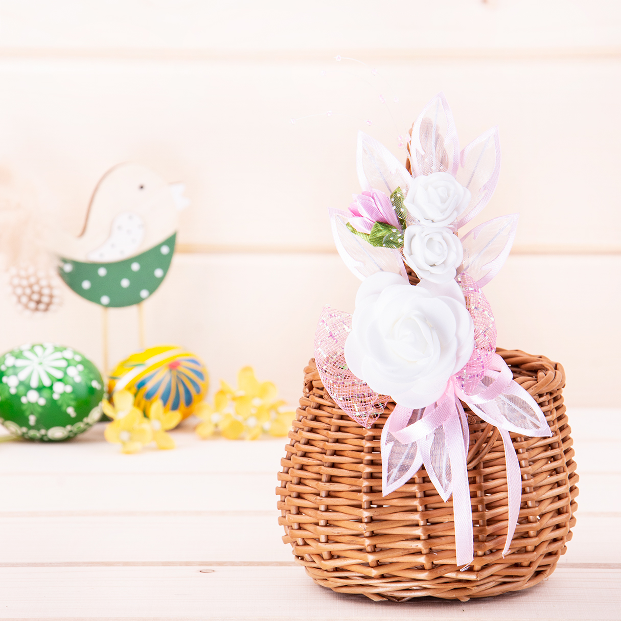 Ozdoba z motywem różyczek to subtelny element dekoracyjny, który podkreśli tradycyjny i elegancki wygląd koszyczka wielkanocnego.