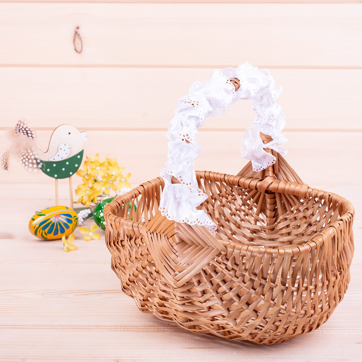 Stylowa ozdoba na rączkę koszyka wykonana z delikatnej, białej satyny to idealny dodatek do koszyka wielkanocnego. Subtelne marszczenia i romantyczny charakter dekoracji nadają koszykowi wyjątkowy, elegancki wygląd. Dzięki elastycznej formie ozdoba łatwo dopasowuje się do rączki koszyka, tworząc estetyczne i harmonijne wykończenie świątecznej dekoracji.