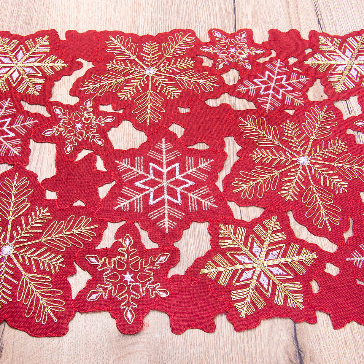 Pas świąteczny haftowany 40x150 cm RXH23091-1 Śnieżynki na czerwonym tle