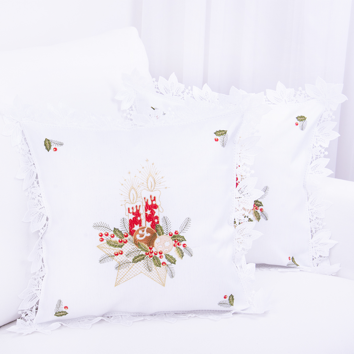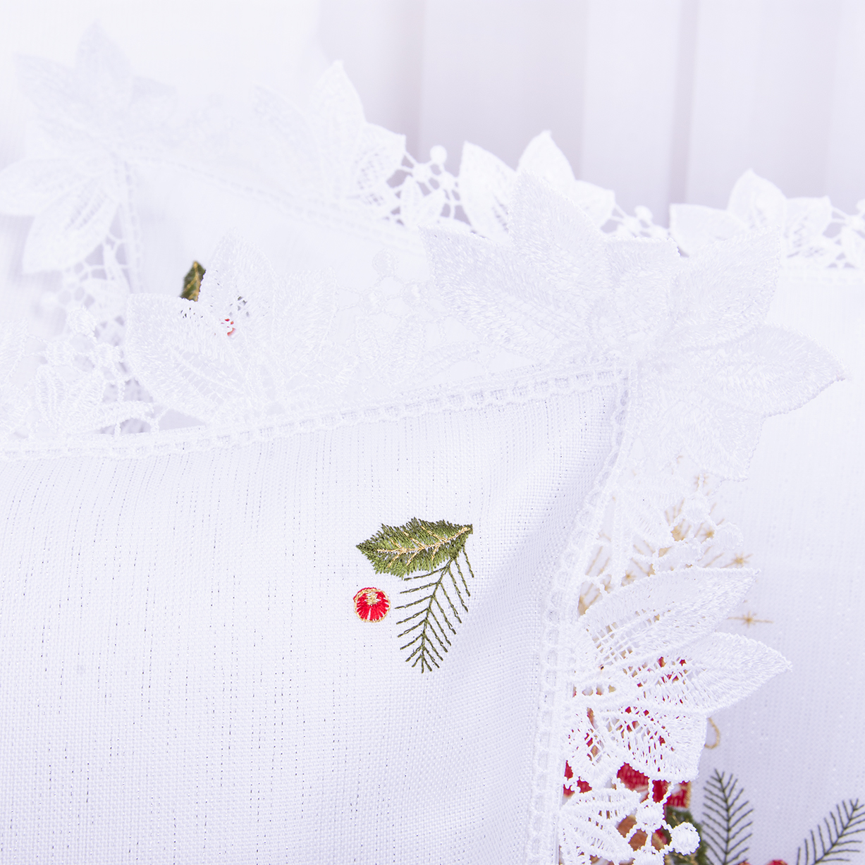 Poszewka świąteczna 40x40 cm Haftowana Świąteczny stroik na białym tle z ozdobną białą gipiurą