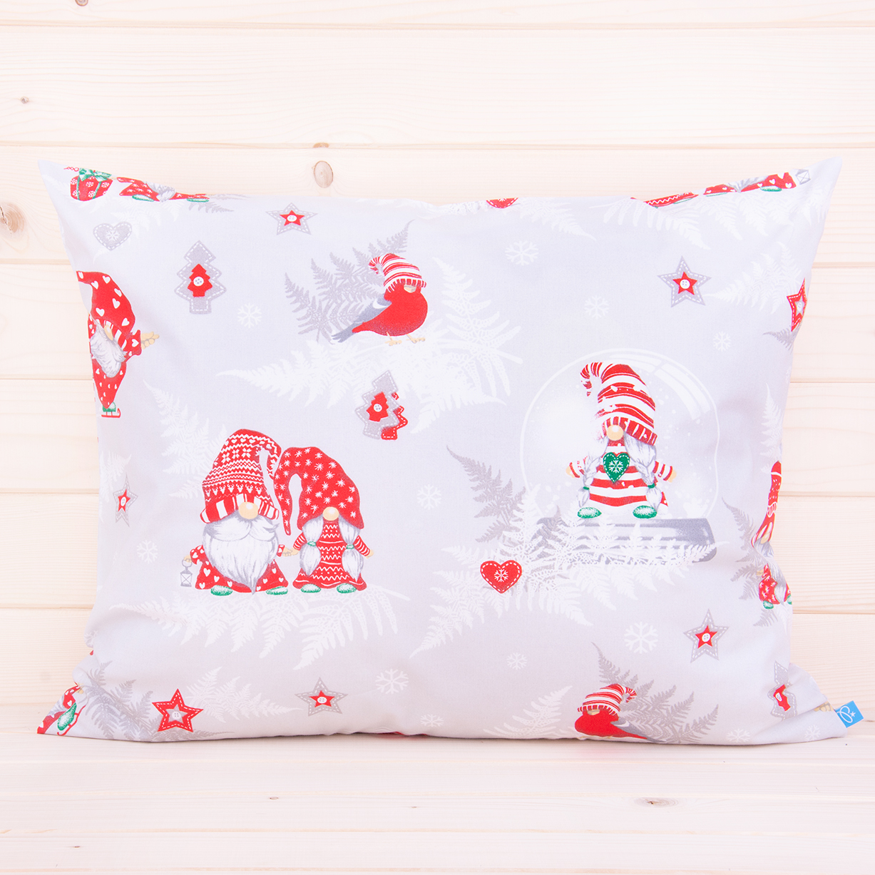 Poszewka świąteczna 50x70 cm wzór 30 Czerwone krasnale w kuli śnieżnej na szarym tle