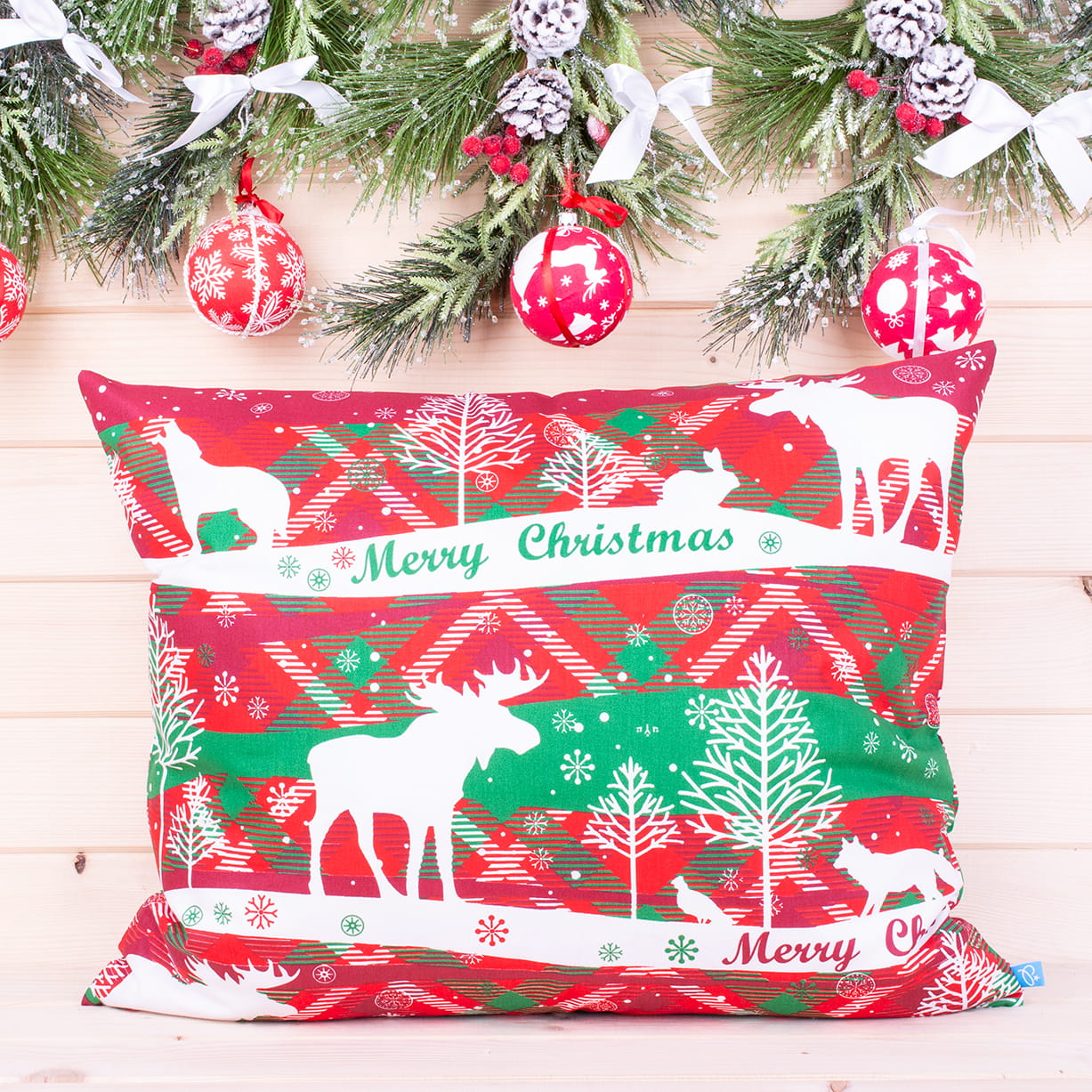 Poszewka świąteczna 50x70 cm wzór 4 Białe renifery na czerwono-zielonym tle