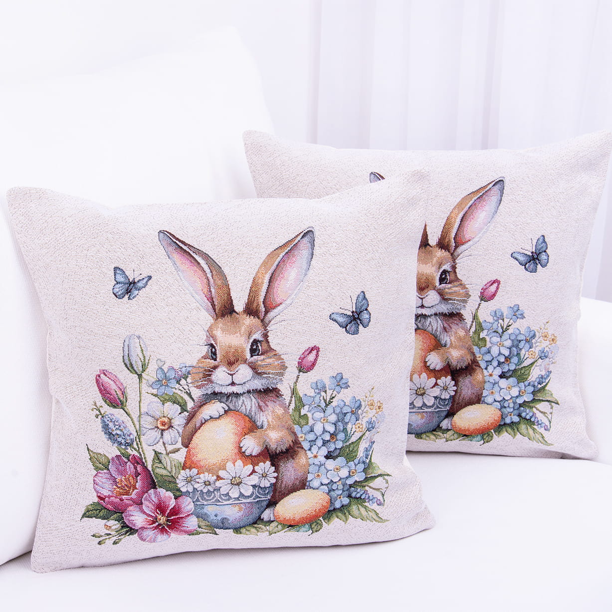 Elegancka poszewka gobelinowa 42x42 cm z motywem wielkanocnym to wyjątkowa dekoracja, która wprowadzi do wnętrza świeżość i radosny, wiosenny klimat. Uroczy zajączek trzymający pisankę, otoczony delikatnymi kwiatami oraz subtelnymi motylami, tworzy harmonijną kompozycję idealną na okres Wielkanocy.
