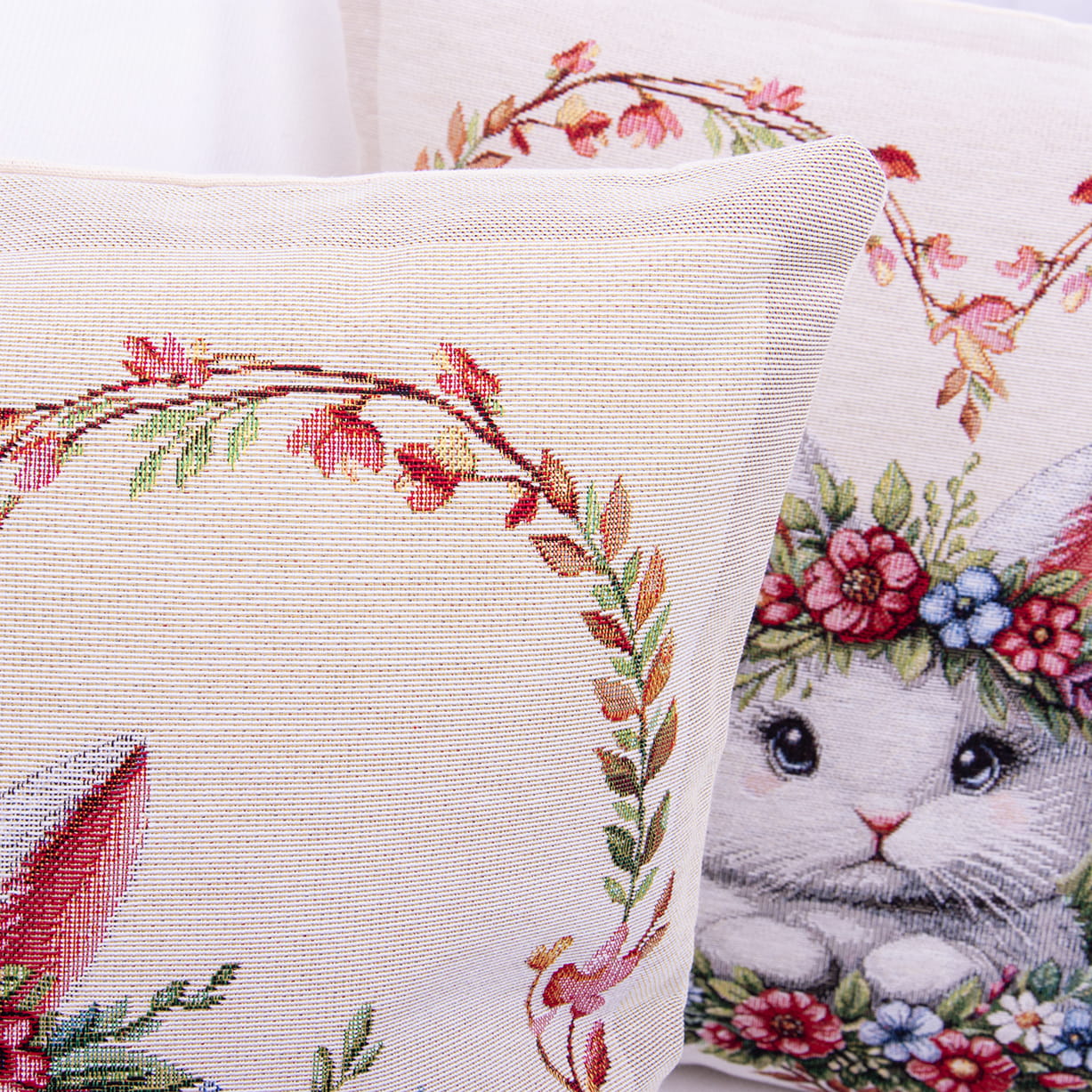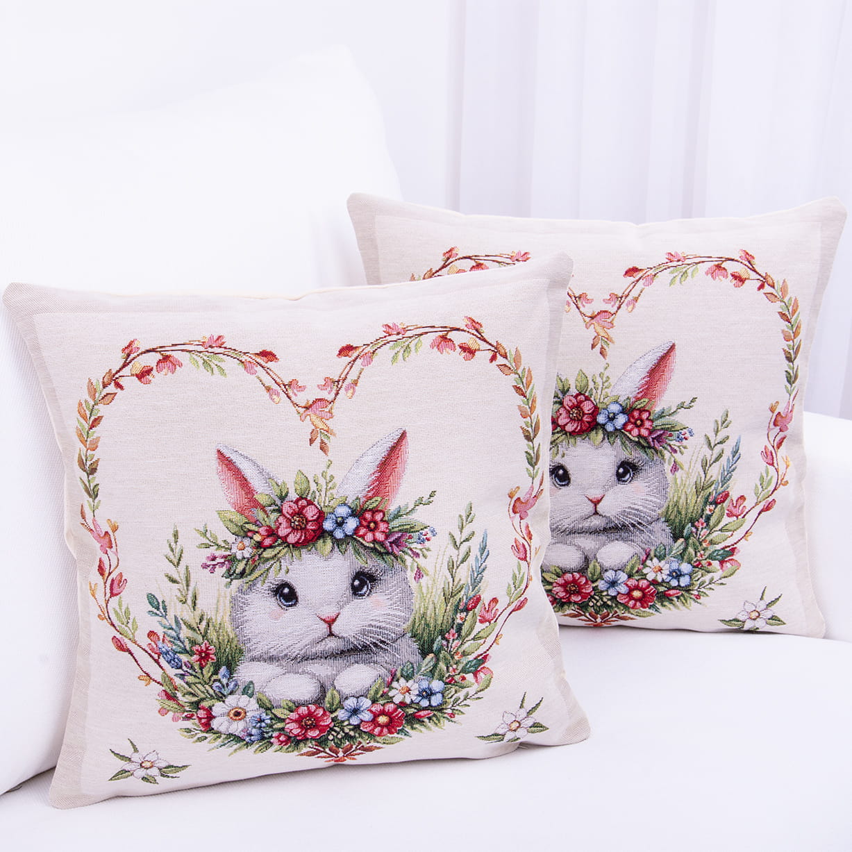 Poszewka gobelinowa 42x42 cm – wielkanocny zajączek w kwiatowym sercu
