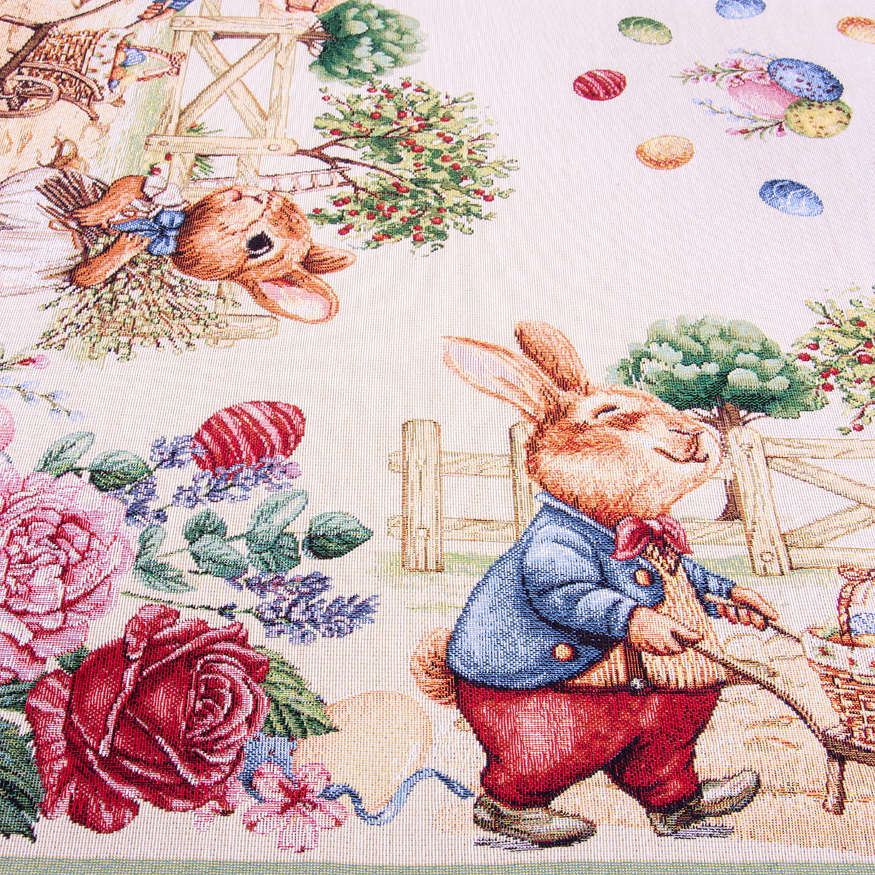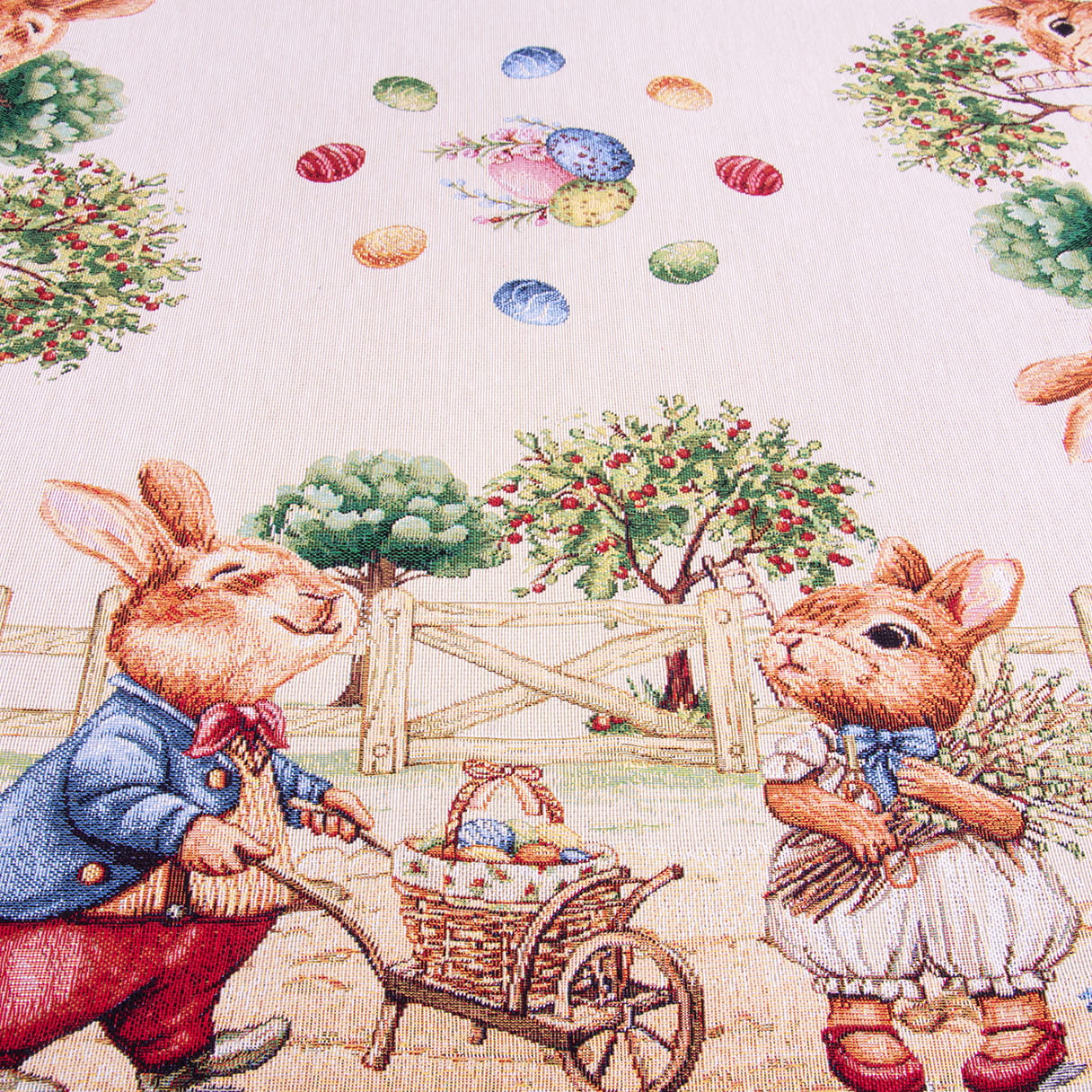 Wprowadź świąteczny nastrój do swojego domu dzięki eleganckiej serwecie gobelinowej z uroczym motywem wielkanocnych zajączków.