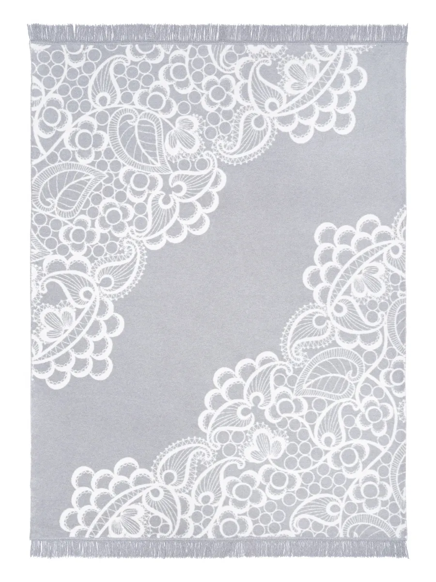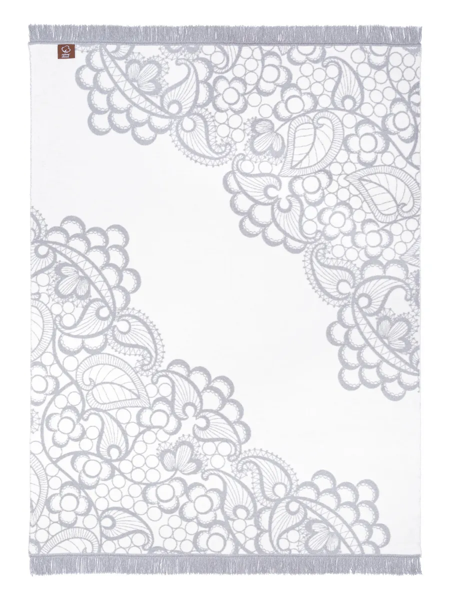 Koc utrzymany jest w stonowanej szaro-kremowej kolorystyce, która tworzy harmonijny i elegancki efekt wizualny. Delikatny ornament przypominający koronkę pięknie prezentuje się na całej powierzchni materiału, dzięki czemu koc może pełnić nie tylko funkcję praktycznego okrycia, ale także stylowej narzuty na łóżko lub sofę.