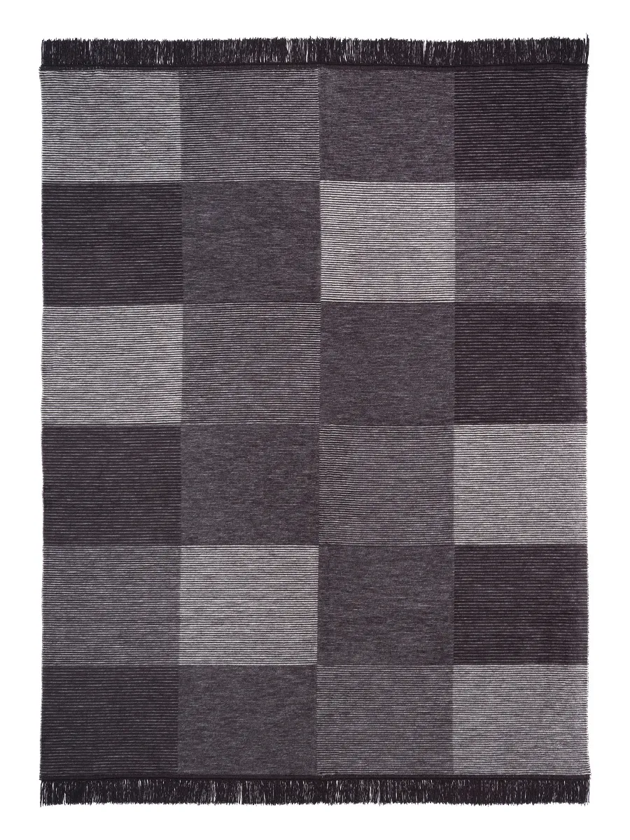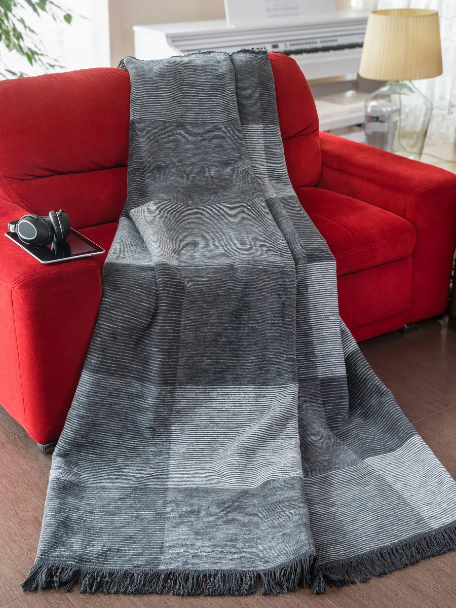 Koc utrzymany jest w eleganckiej grafitowo-szarej kolorystyce, która wprowadza do wnętrza nowoczesność i subtelną elegancję. Kontrast pomiędzy ciemniejszymi i jaśniejszymi odcieniami szarości podkreśla geometryczny układ kwadratów, dzięki czemu koc świetnie prezentuje się zarówno jako praktyczne okrycie, jak i dekoracyjna narzuta na łóżko lub sofę.